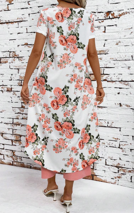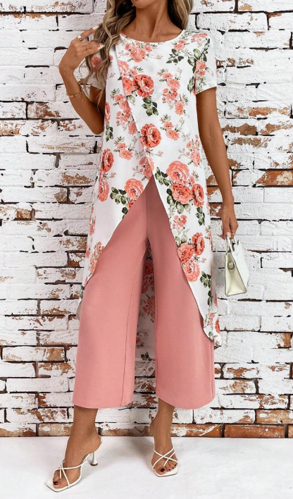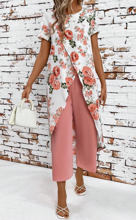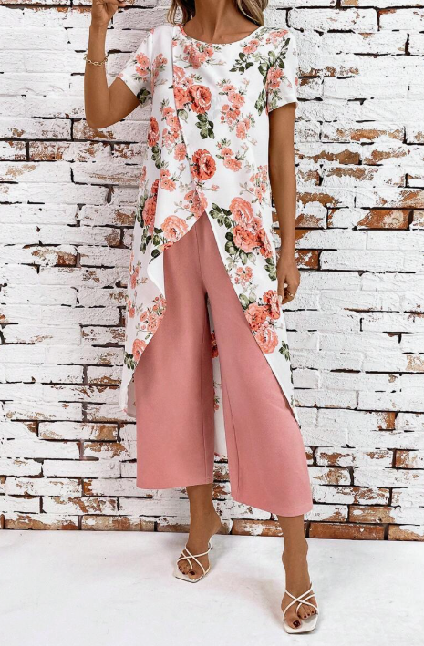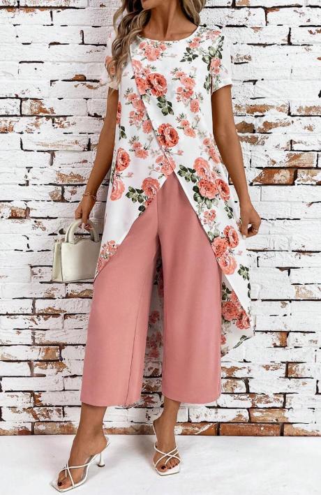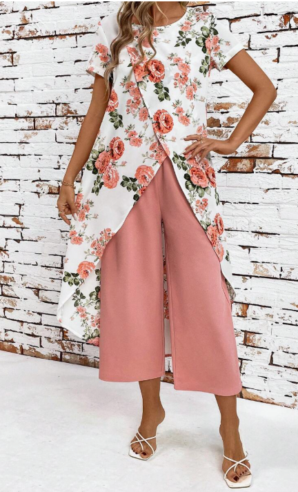 Scopri il set floreale più raffinato della stagione, perfetto per chi ama distinguersi con stile e femminilità. Il top asimmetrico a strati con stampa floreale aggiunge un tocco di classe, mentre i pantaloni ampi e fluidi garantiscono massimo comfort ed eleganza in ogni occasione.
