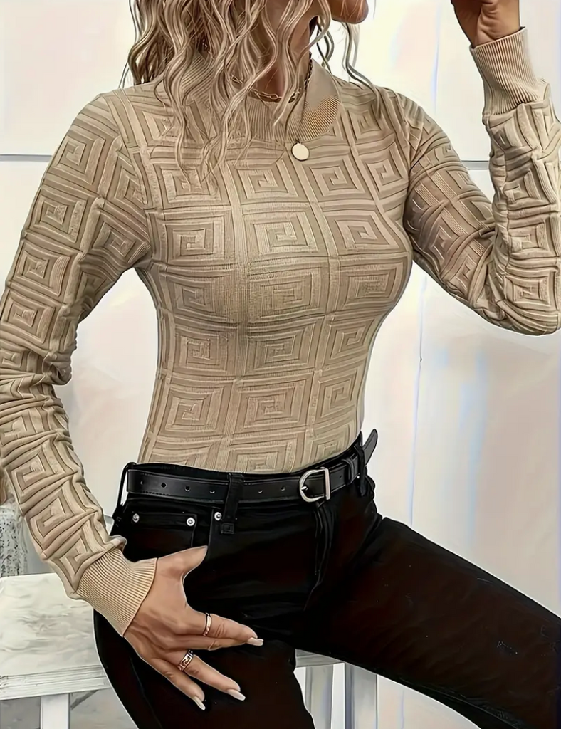 Questa maglia è ideale per le donne che desiderano un capo versatile e allo stesso tempo sofisticato. Il tessuto elasticizzato offre una vestibilità aderente ma confortevole, mentre il design geometrico dona un tocco di eleganza senza sforzo. Perfetta per l'ufficio, un aperitivo con amici o una cena speciale.